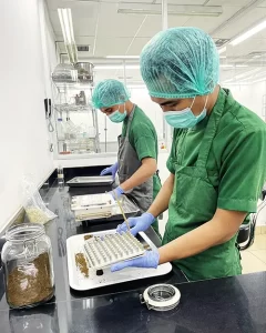 Therapure Nutraceuticals Laboratory Staff are manually encapsulating and bottling herbal compounds freshly manufactured the same day.