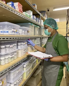 The Chief Pharmacist inspects and inventories herbal capsule medicines in the climate controlled storage facility at Bali.