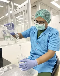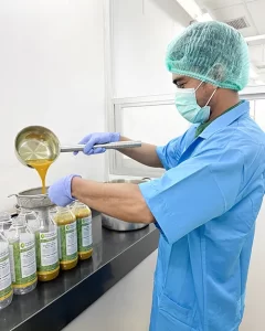 A Therapure Nutraceuticals Lab Technition fills 1 liter bottles with freshly-formulated Jamu Jo Organic Herbal Tonics – these will be directly placed into deep freezing, which both enhances and preserves these traditional medicines.