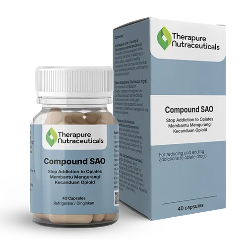 Actions: Opiate-like chemical structures contained in Compound SAO compensate the need for opiates, with no withdrawal symptoms. Levodopa (L-dopa) and kavalactones convert to dopamine in the brain. Dopamine is a neurotransmitter that promotes enjoyment and interest in life, while increasing mental focus, motivation, and feelings of pleasure. Compound SAO helps re-supply the brain with dopamine that is essential to opiate addiction treatment.
